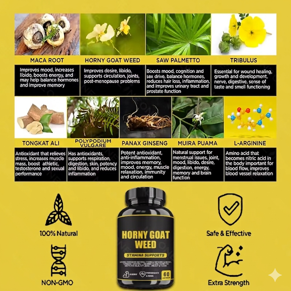 Horny Goat Weed ๐ฟ is a natural herbal supplement known for boosting libido, supporting energy, enhancing stamina, and promoting overall vitality for improved performance and confidence.